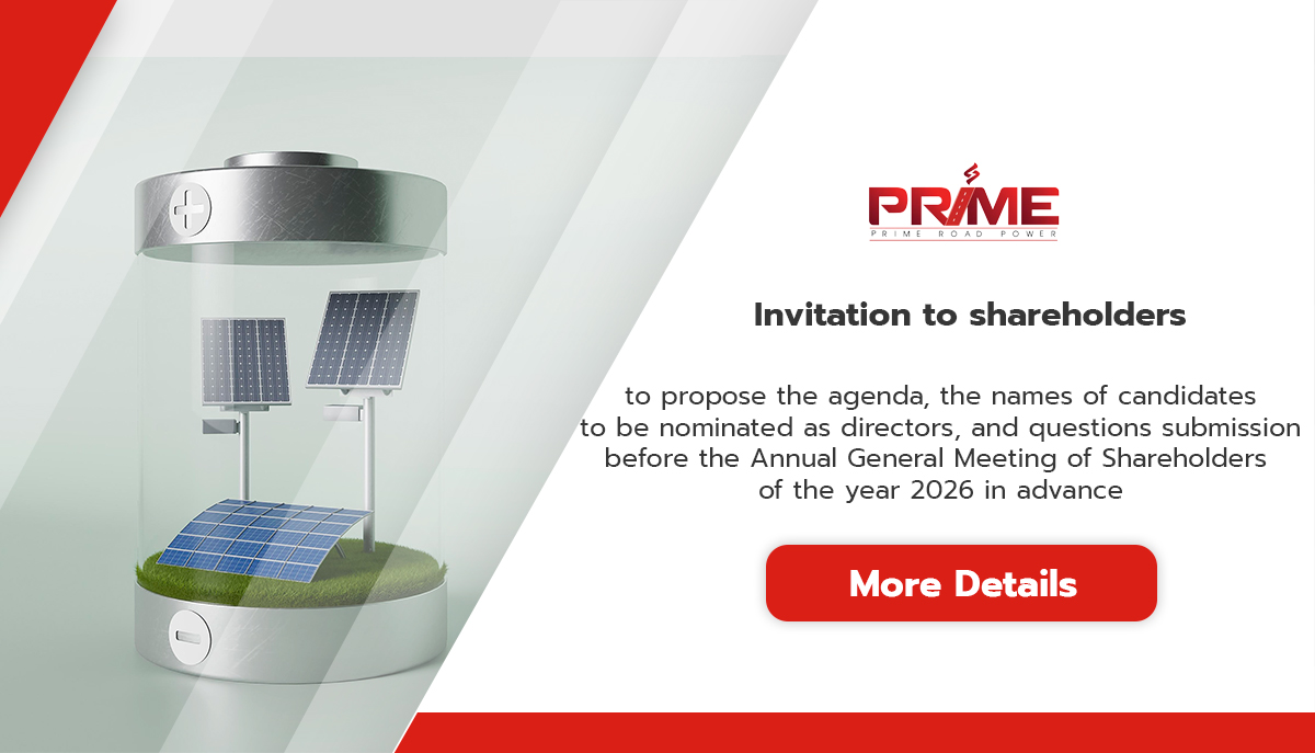 Prime Road Power is a SET-listed renewable energy company. Prime Road Power Public Company Limited (“PRIME”) is a leading renewable energy company that focuses on advanced technologies for a better and more sustainable society and environment. PRIME’s core businesses include solar power plant development, Solar Rooftop installation and private-sector electricity trading under Power Purchase Agreements (Private PPA), engineering services (EPC), and comprehensive Solar Rooftop installation. Additionally, the company engages in the trade of energy-related materials, equipment, and technology solutions for energy and environmental sustainability.